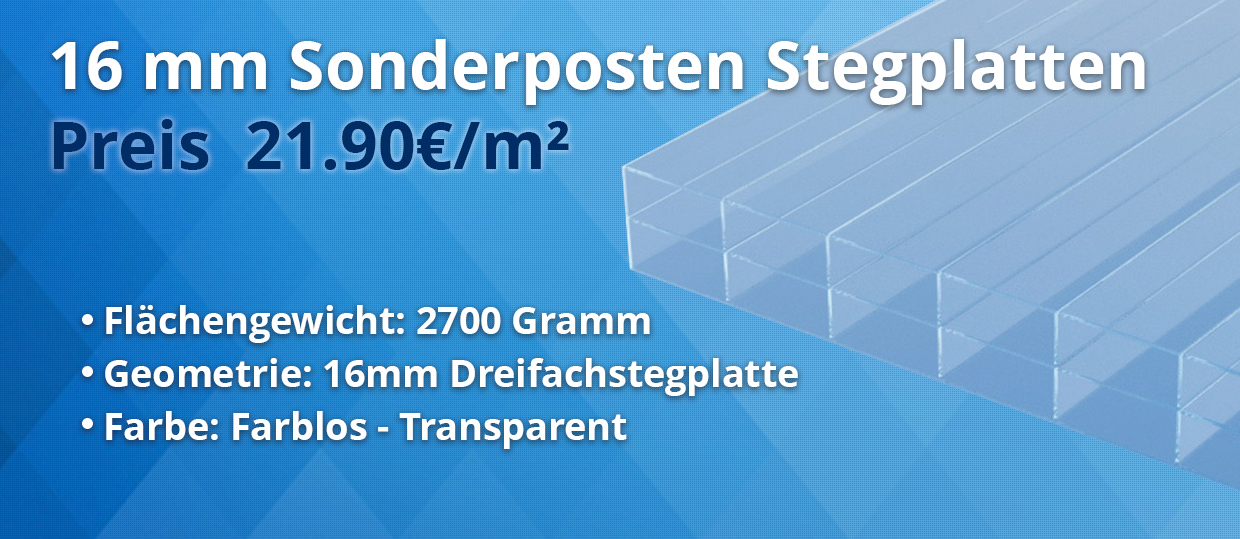 Achten Sie auch bei günstigen Stegplatten auf das Flächengewicht. Unsere Sonderposten Stegplatten haben trotz des günstigen Preises ein Flächengewicht von 2700 Gramm und eine UV- Vergütung. Schon ein paar Gramm weniger im Flächengewicht machen einen großen Unterschied in der Tragfähigkeit und Statik aus! Von 16 mm Stegplatten mit einem Flächengewicht von 2500 Gramm oder sogar noch weniger raten wir dringend ab, da die Tragfähigkeit erheblich beeinträchtigt wird.