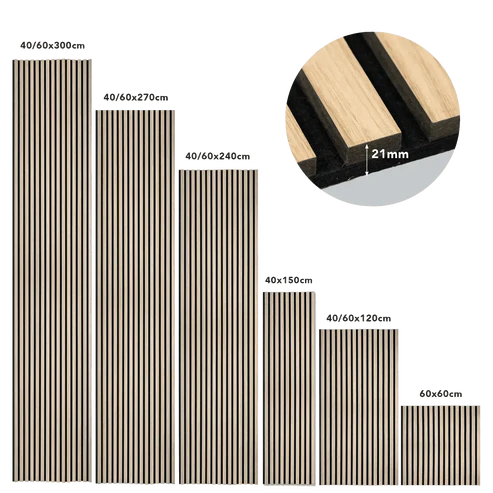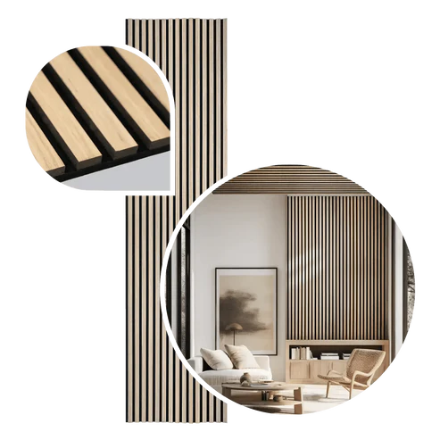 Unsere Akustikpaneele werden aus umweltfreundlichen Materialien gefertigt. Der akustische Filz stammt aus recyceltem Material, und die Holzlamellen bestehen aus MDF.