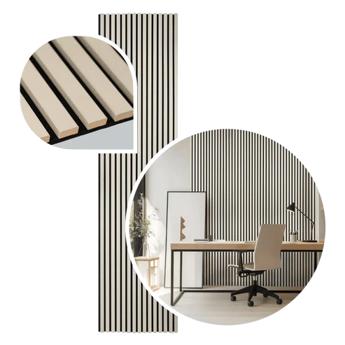 Unsere Akustikpaneele werden aus umweltfreundlichen Materialien gefertigt. Der akustische Filz stammt aus recyceltem Material, und die Holzlamellen bestehen aus MDF.