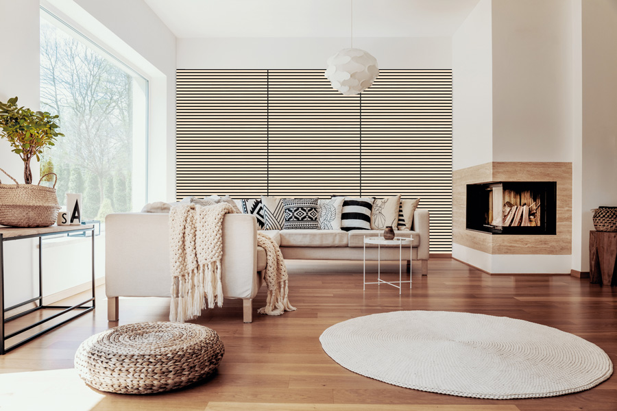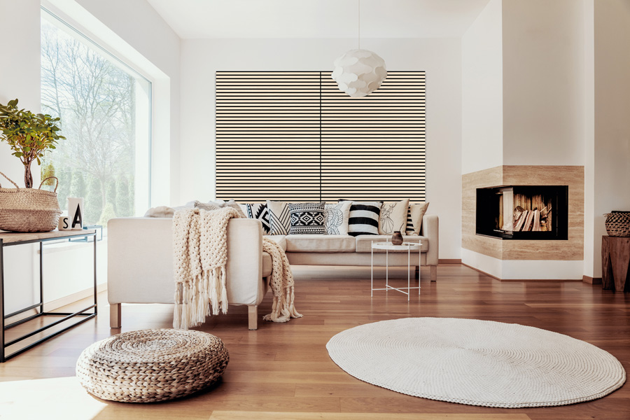 Die Trägerplatte der Paneele besteht aus recyceltem PET-Filz, während das Echtholzfurnier der MDF-Lamellen zu 100 % aus nachhaltig bewirtschafteten Wäldern stammt. Diese Materialkombination verbindet Umweltbewusstsein mit hoher Qualität und zeitloser Ästhetik.