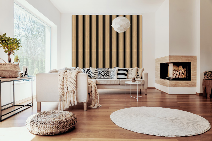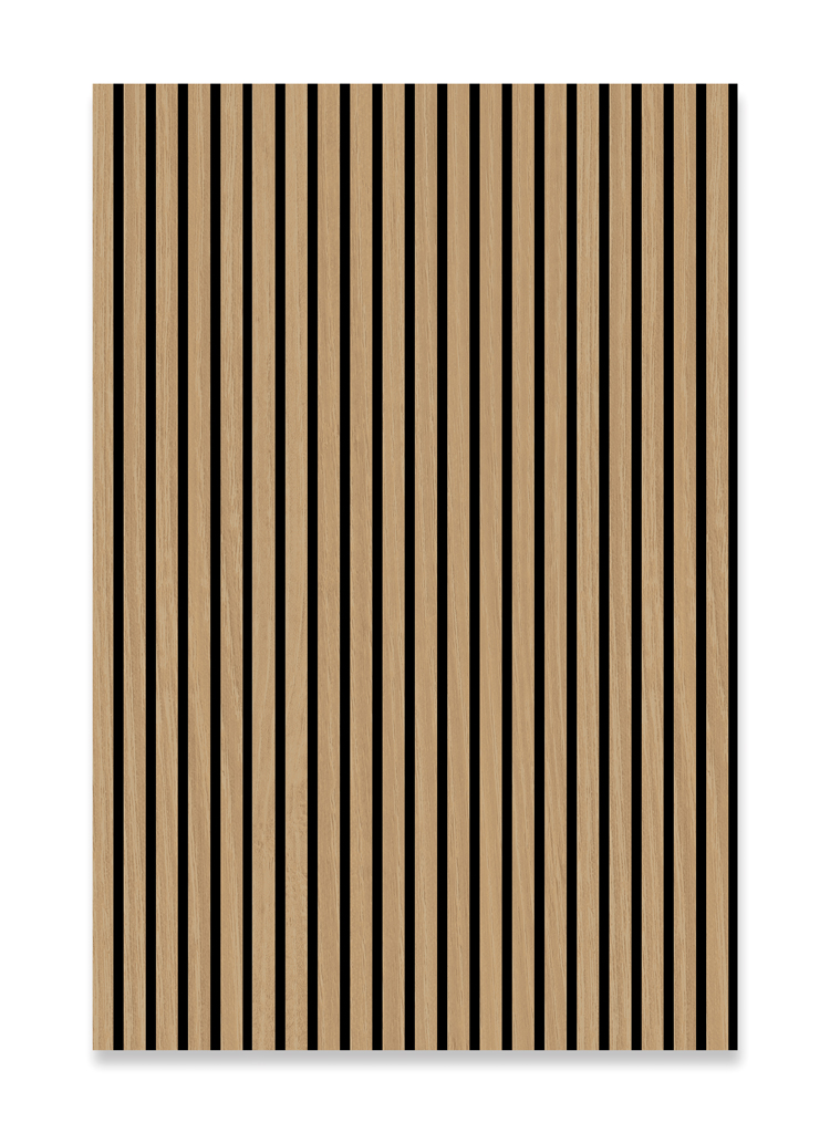 Die Trägerplatte der Paneele besteht aus recyceltem PET-Filz, während das Echtholzfurnier der MDF-Lamellen zu 100 % aus nachhaltig bewirtschafteten Wäldern stammt. Diese Materialkombination verbindet Umweltbewusstsein mit hoher Qualität und zeitloser Ästhetik.
