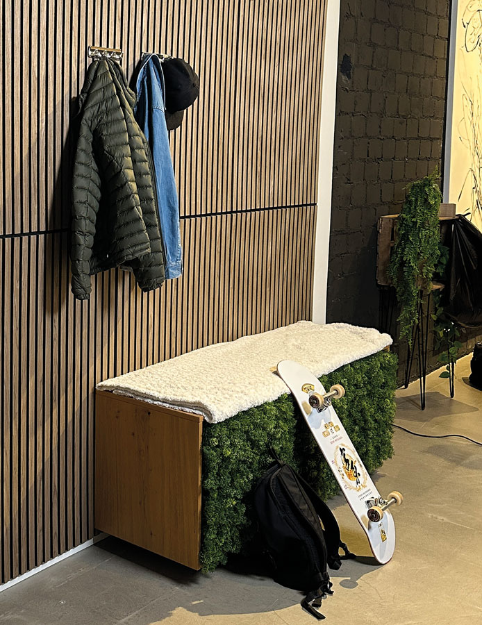Die Trägerplatte der Paneele besteht aus recyceltem PET-Filz, während das Echtholzfurnier der MDF-Lamellen zu 100 % aus nachhaltig bewirtschafteten Wäldern stammt. Diese Materialkombination verbindet Umweltbewusstsein mit hoher Qualität und zeitloser Ästhetik.
