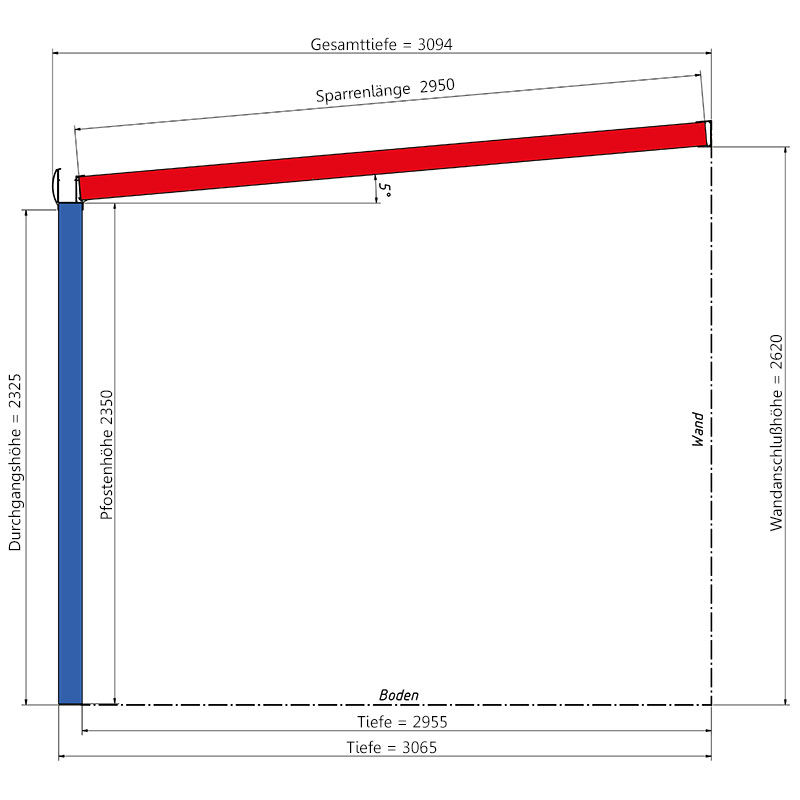 Die Maßangaben beziehen sich nicht auf die absoluten Außenmaße der Überdachung. Bitte schauen Sie sich hierzu die Detailzeichnung bei den weiteren Produktbildern sowie den Reiter "Lieferumfang" an.