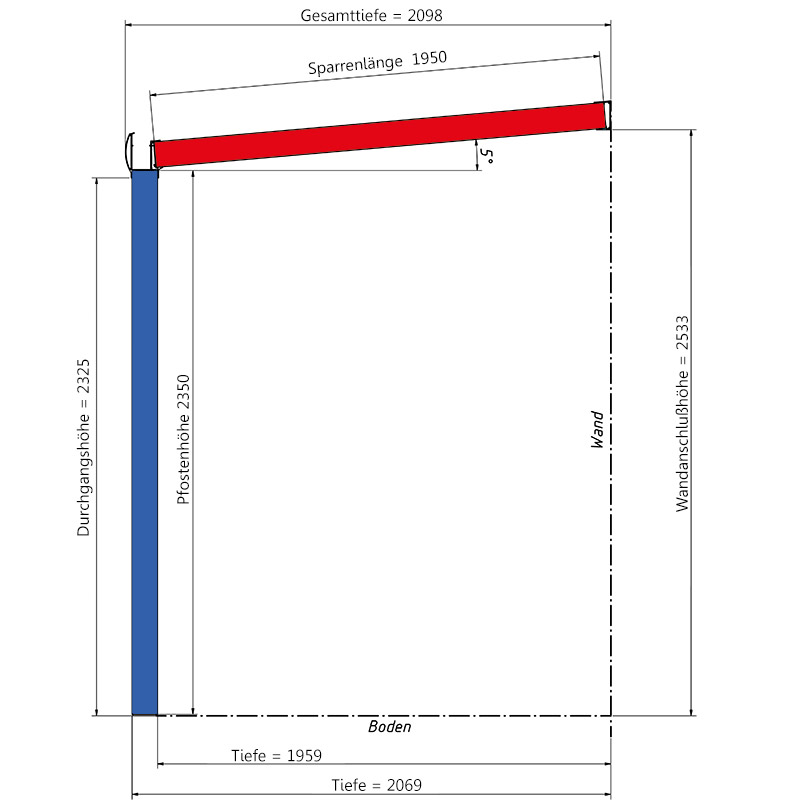 Die Maßangaben beziehen sich nicht auf die absoluten Außenmaße der Überdachung. Bitte schauen Sie sich hierzu die Detailzeichnung bei den weiteren Produktbildern sowie den Reiter "Lieferumfang" an.