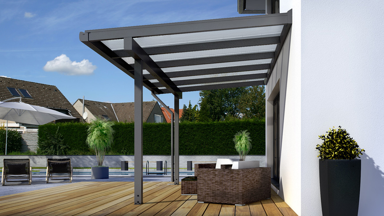 Mit einem Terrassendach aus Aluminium der Serie "Classic" in Premiumqualität verwandeln Sie Ihre Terrasse in einen Außenbereich, der sich vom Frühjahr bis in den Herbst individuell nutzen lässt. Egal ob kleine oder große Terrassen, welche direkt am Haus angrenzen, lassen sich diese mit unseren Premium Aluminium-Terrassenüberdachung, hochwertig und effektiv gestalten. Die Terrassenüberdachung kann selbstverständlich noch durch zusätzliche Komponenten wie Einbaustrahler, Seitenkeile, Terrassenwände oder einer Schiebetüranlage erweitert werden.