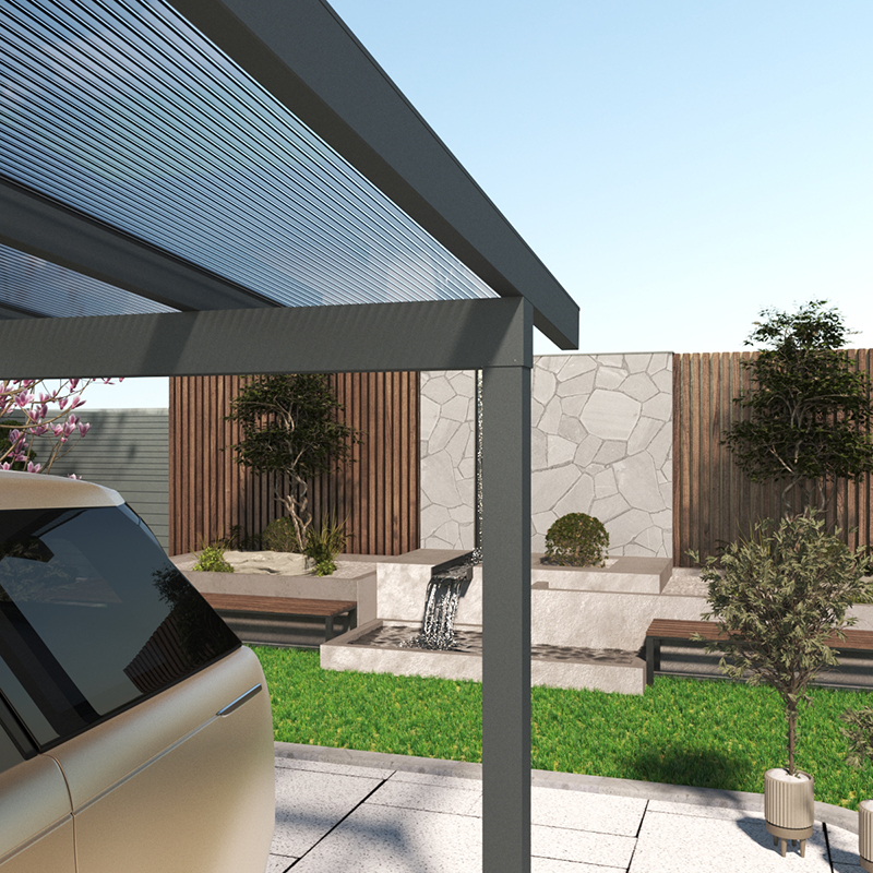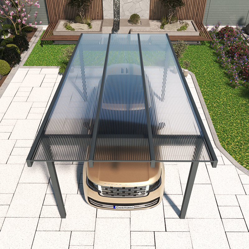 Bei den einzelnen Komponenten der Unterkonstruktion des Carports handelt es sich um pulverbeschichtete, stranggepresste Aluminiumprofile. Durch die Herstellung im Strangpressverfahren sind alle Profile wie aus einem Guss, also naht- und verzugsfrei, sowie ausgesprochen belastbar. Wir bieten Ihnen unsere Unterkonstruktion in zwei Farben an. Zum einen bekommen Sie das Carport in einem zeitlosen weiß, oder einem modernen Anthrazit (DB703) mit Feinstruktur. Auch bei der Auswahl der Stegplatten setzen wir ausschließlich auf namenhafte Produkte wie Makrolon, Lexan oder Plexiglas.