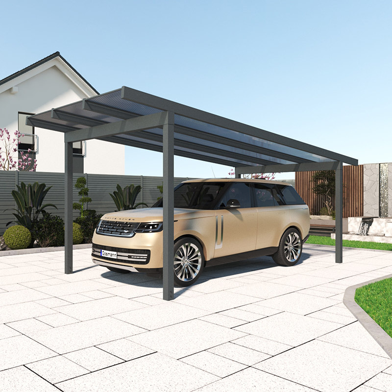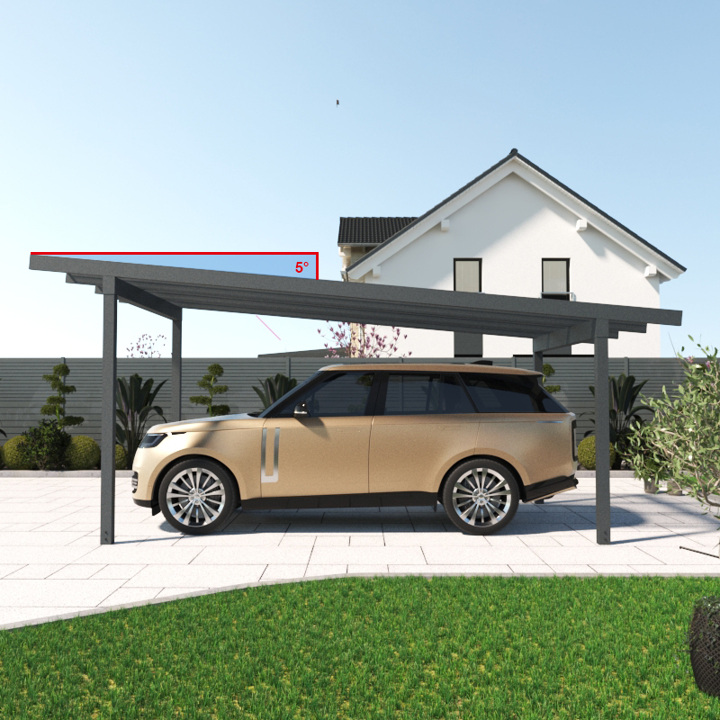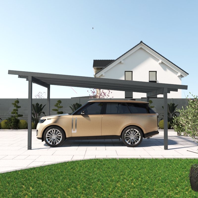 Mit einem Carport aus Aluminium in Premiumqualität bieten Sie Ihrem Fahrzeug Schutz vor Witterungseinflüssen wie Regen, Schnee oder Hagel. Egal ob eine kleine oder große Einfahrt, lassen sich diese mit unseren Aluminium-Carport, hochwertig und effektiv gestalten. Ein großer Vorteil von unserem Flachdach-Carport ist, das es freistehend montiert werden kann und nicht direkt am Haus angeschlossen werden muss. Bitte achten Sie bei der Montage darauf, das die Sparren an beiden Seiten 500mm über dem Hauptträger ragen müssen. Selbstverständlich können Sie Ihr Carport noch mit zusätzliche Komponenten wie Einbaustrahler oder Seitenwänden erweitert werden . Auch eine Verlängerung der Pfosten ist kein Problem, so das auch Ihr Wohnmobil problemlos einen Platz unter dem neuen Carport finden kann.