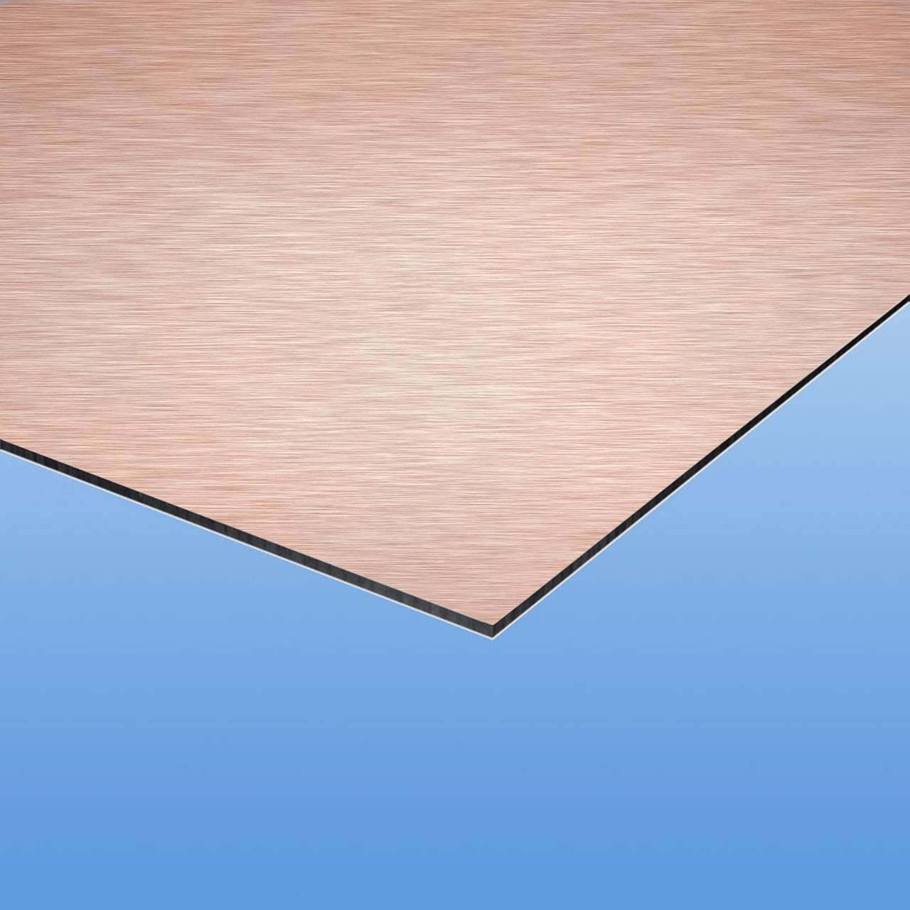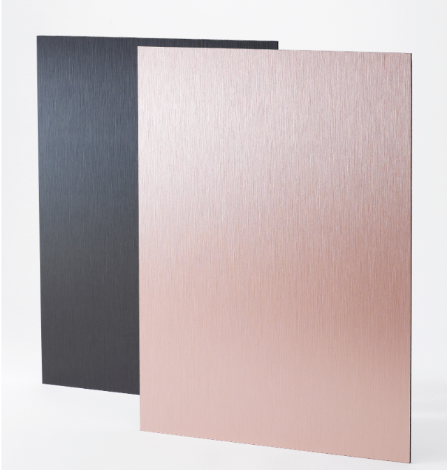 Das charakteristische, gebürstete Aussehen von DIBOND Butlerfinish® entsteht durch ein spezielles Verfahren, bei dem ein Oberflächenschliff in das Deckblech eingewalzt und anschließend mit Klarlack einbrennlackiert wird. Bei dieser Platte liegt der Vorteil darin, dass die Platte einseitig Anthrazit und die Rückseite Rose ist. Somit kann ich mit einer Platte zwei Farben abdecken.