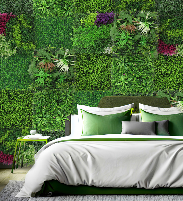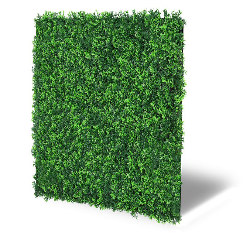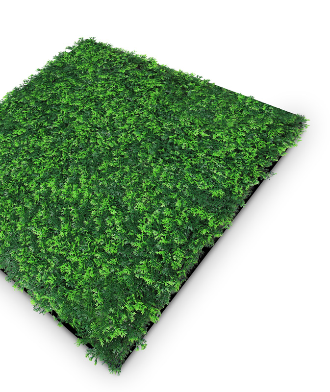 Die Flora Design Paneele begeistern mit ihrer naturnahen Optik und kräftigen Grüntönen. Als hochwertige Kunstblumen/ Kunstgras-Installation sind sie dabei vollkommen pflegefrei: Kein Gießen, kein Düngen und keine spezielle Beleuchtung erforderlich. So bleibt die frische, natürliche Ausstrahlung dauerhaft erhalten – ganz ohne Aufwand.