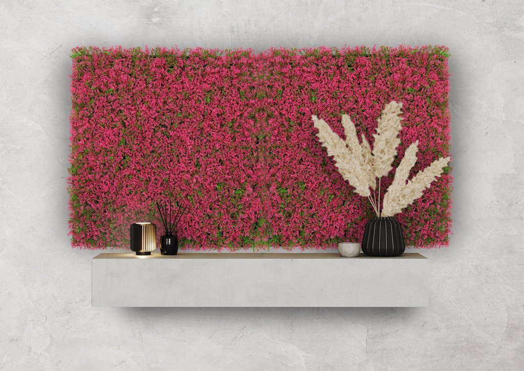 Die Flora Design Paneele überzeugen mit ihrer intensiven pinkfarbenen Grasstruktur und einer naturnahen, lebendigen Optik. Als hochwertige Kunstpflanzen-Installation sind sie dabei vollkommen pflegefrei: Kein Gießen, kein Düngen und keine spezielle Beleuchtung notwendig. So bleibt die kraftvolle Farbwirkung dauerhaft erhalten – ganz ohne Aufwand.