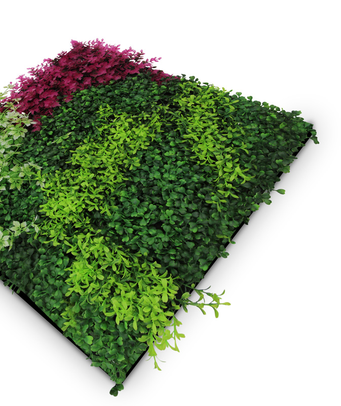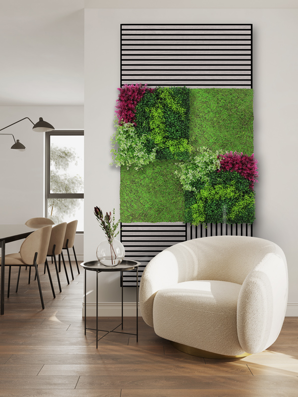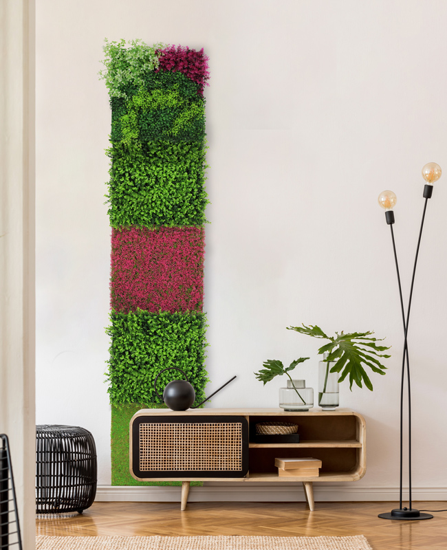 Die Flora Design Paneele begeistern mit ihrer intensiven violetten Blüten- und Pflanzenstruktur und einer naturnahen, lebendigen Optik. Als hochwertige Kunstpflanzen-Installation sind sie dabei vollkommen pflegefrei: Kein Gießen, kein Düngen und keine spezielle Beleuchtung notwendig. So bleibt die ausdrucksstarke Farbwirkung dauerhaft erhalten – ganz ohne Aufwand.