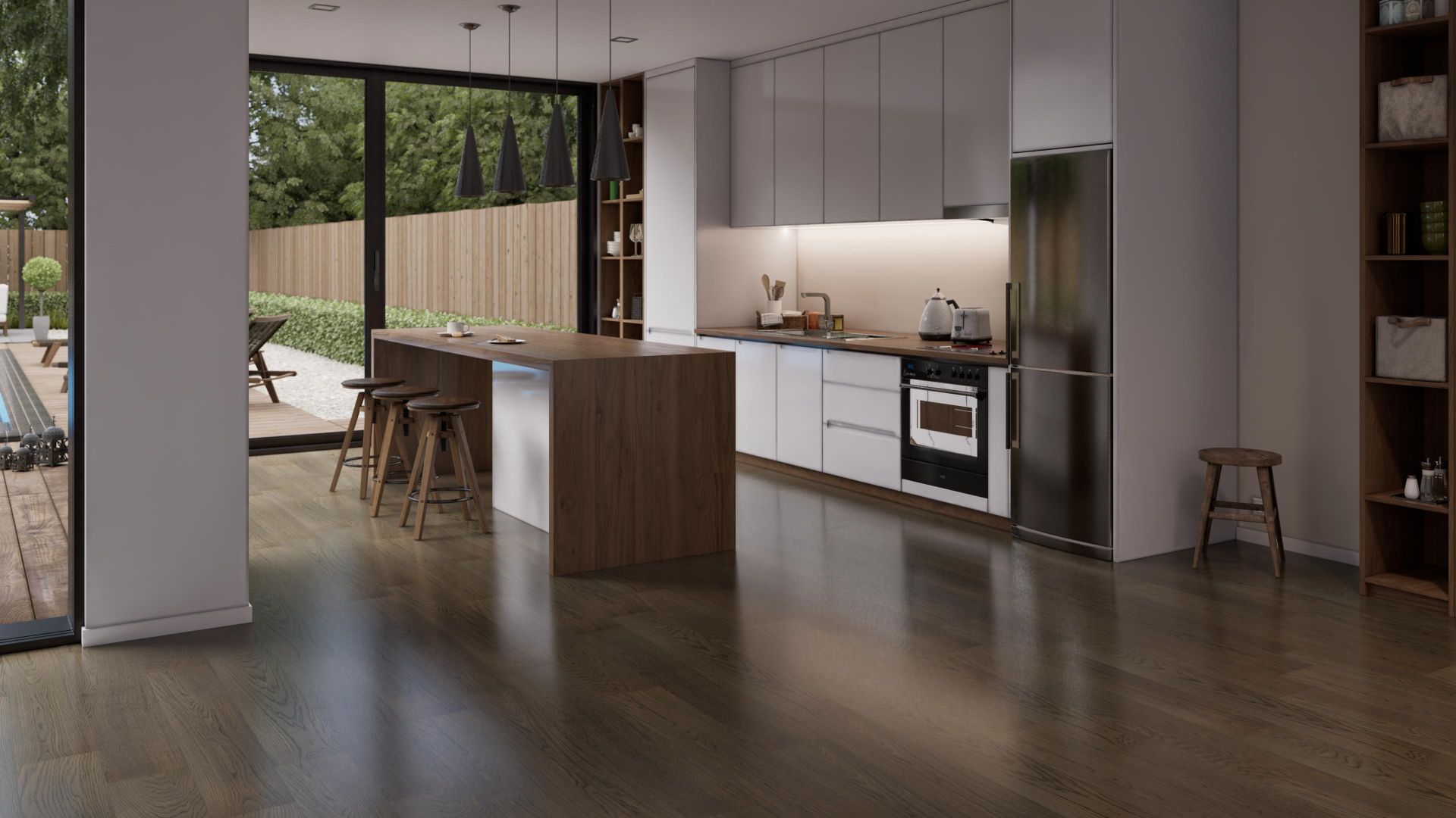 Die dunkle, elegante Holzoptik im Farbton „Midnight Wheat“ verleiht Räumen eine stilvolle und moderne Atmosphäre. Dank Synchronprägung und Echtholzoberfläche entsteht eine besonders authentische Haptik und Optik. Die klassische 1-Stab Landhausdiele mit umlaufender 4V-Fuge sorgt für ein realistisches Dielenbild und unterstreicht den hochwertigen Charakter des Bodens.
