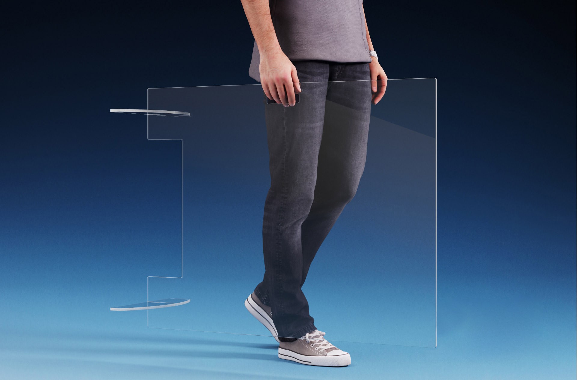 Nehmen Sie Ihren frei aufstellbaren Infektionsschutz in passender Größe einfach mit. Eine sehr breite untere Aussparung erlaubt Ihnen gemeinsame Übungen oder sonstigen Austausch und trennt dabei fast unsichtbar: wirksamer Schutz vor infektiösen Tröpfchen durch Niesen, Spucken und Husten.