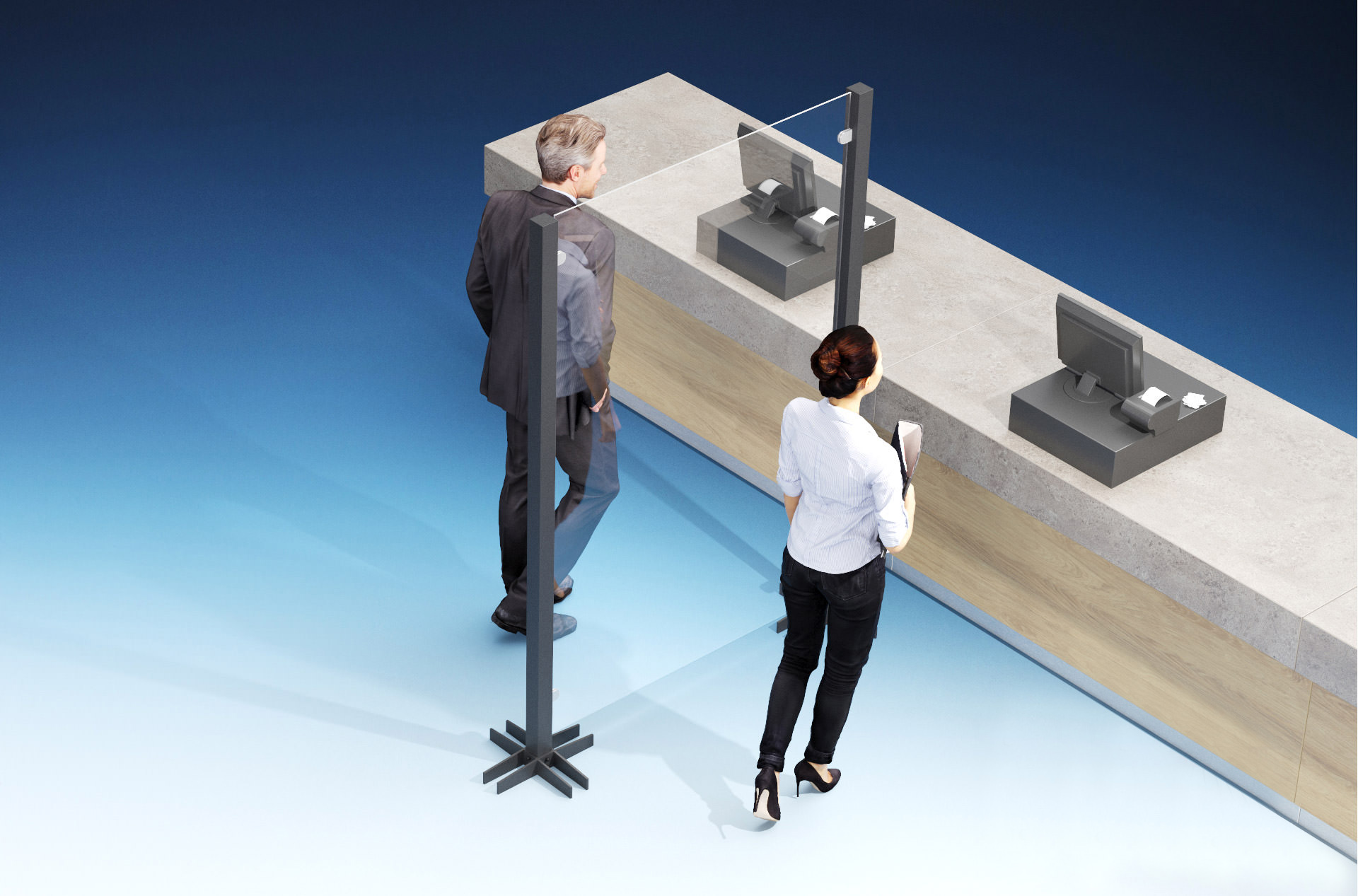 Unauffällig dient die Stellwand als Kundentrenner in seriellen Servicebereichen, sorgt dabei für Diskretion und Infektionsschutz zugleich. Riskante Kontakte sinken auf ein notwendiges Minimum. Ihr Raum für den Publikumsverkehr büßt nicht einmal an Großzügigkeit oder Attraktivität ein, ganz gleich, wie er gestaltet ist.