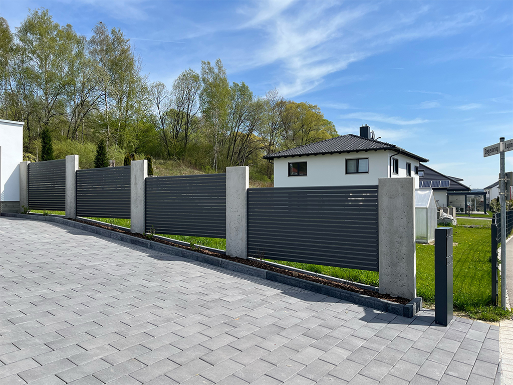 Die Zaunfelder wurden mithilfe stabiler U-Profile und Abstandshaltern zwischen bestehenden Betonsäulen befestigt. Diese Montageart gewährleistet eine sichere und langlebige Befestigung, die sich harmonisch in die vorhandene Bauweise einfügt.