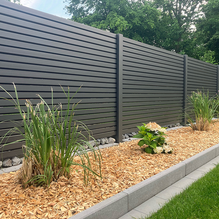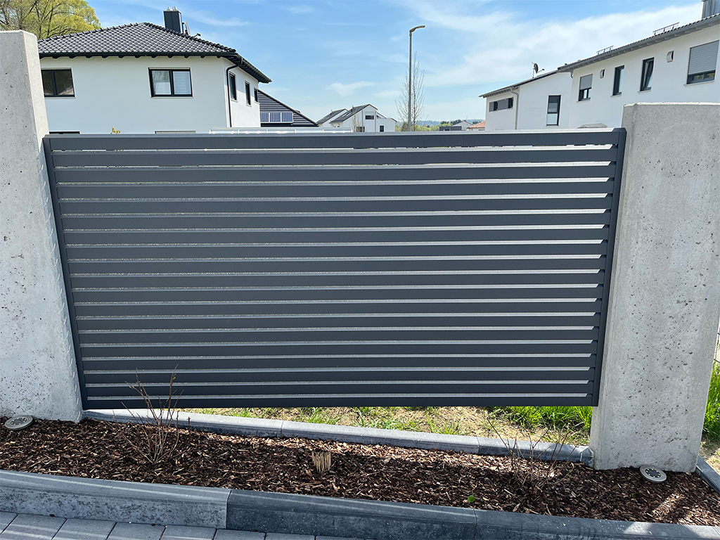 Besonders wichtig war bei diesem Projekt, dass der Zaun von beiden Seiten eine ästhetisch ansprechende Optik bietet. Durch die symmetrische Anordnung der Rhombusprofile und die gleichmäßige Farbgestaltung in Anthrazit fügt sich der Zaun harmonisch in die Umgebung beider Grundstücke ein.