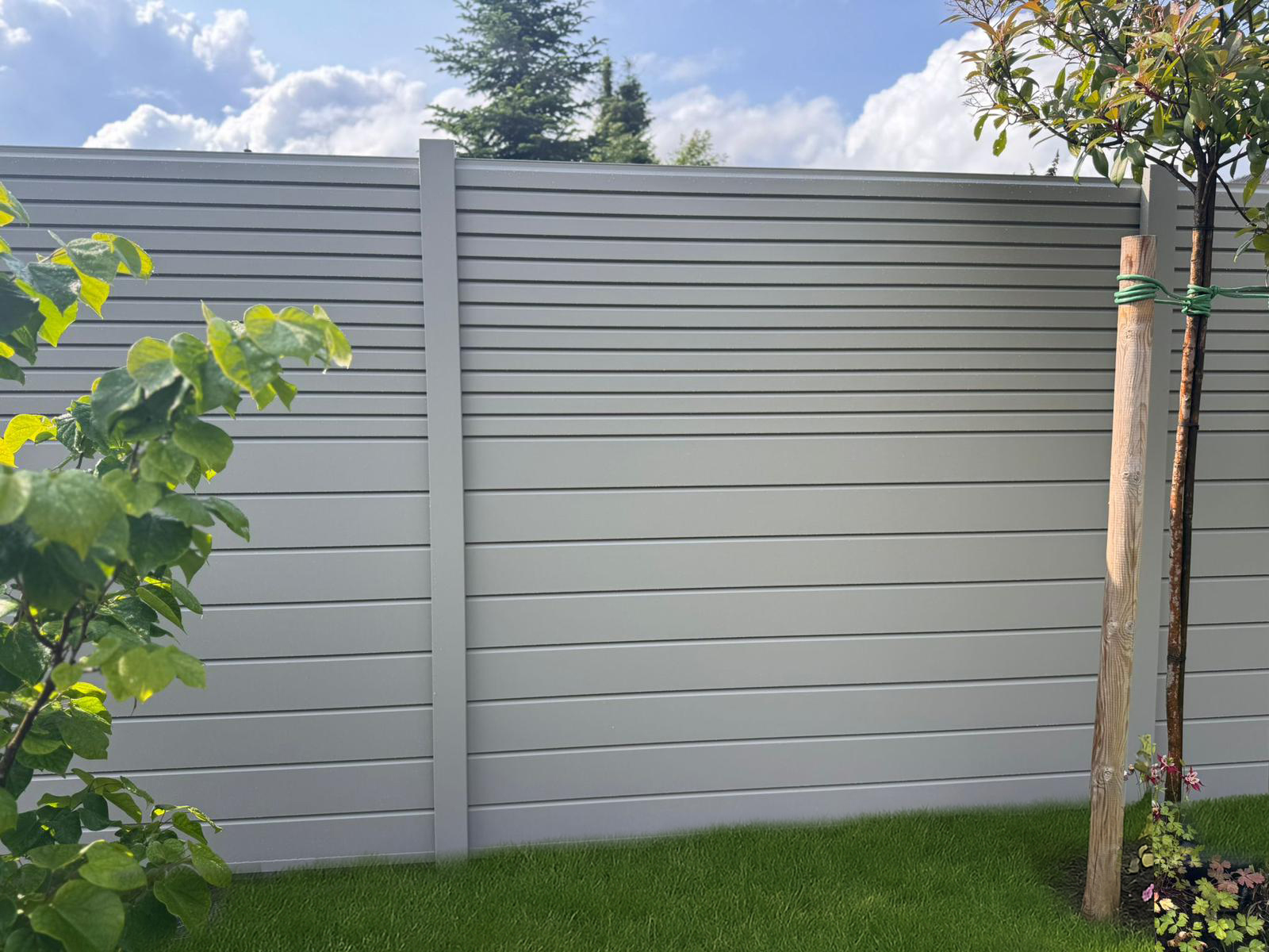 Zur Montage der Zaunfelder wurden Nutpfosten verwendet, die farblich passend zu den Rhombusprofilen beschichtet wurden. Dies sorgt für ein einheitliches Erscheinungsbild und erhöht die Langlebigkeit der Konstruktion. Die Pfosten wurden zur Stabilität dauerhaft im Boden einbetoniert.