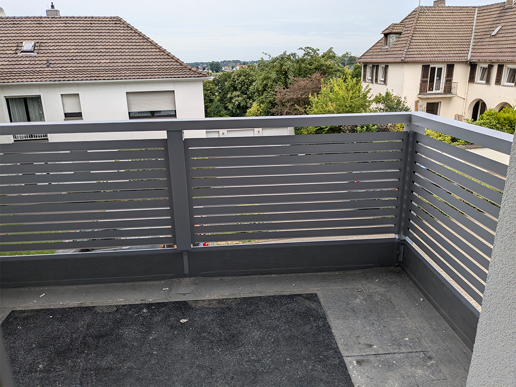 In diesem Projekt wurde eine moderne Balkonverkleidung mit Rhombusleisten realisiert, die exakt nach RAL gefertigt wurden. Der gewählte Farbton wurde dabei gezielt auf die Farbgebung der bestehenden Fensterelemente abgestimmt, um ein harmonisches, durchgängiges Erscheinungsbild in „Ton in Ton“-Optik zu erzielen.