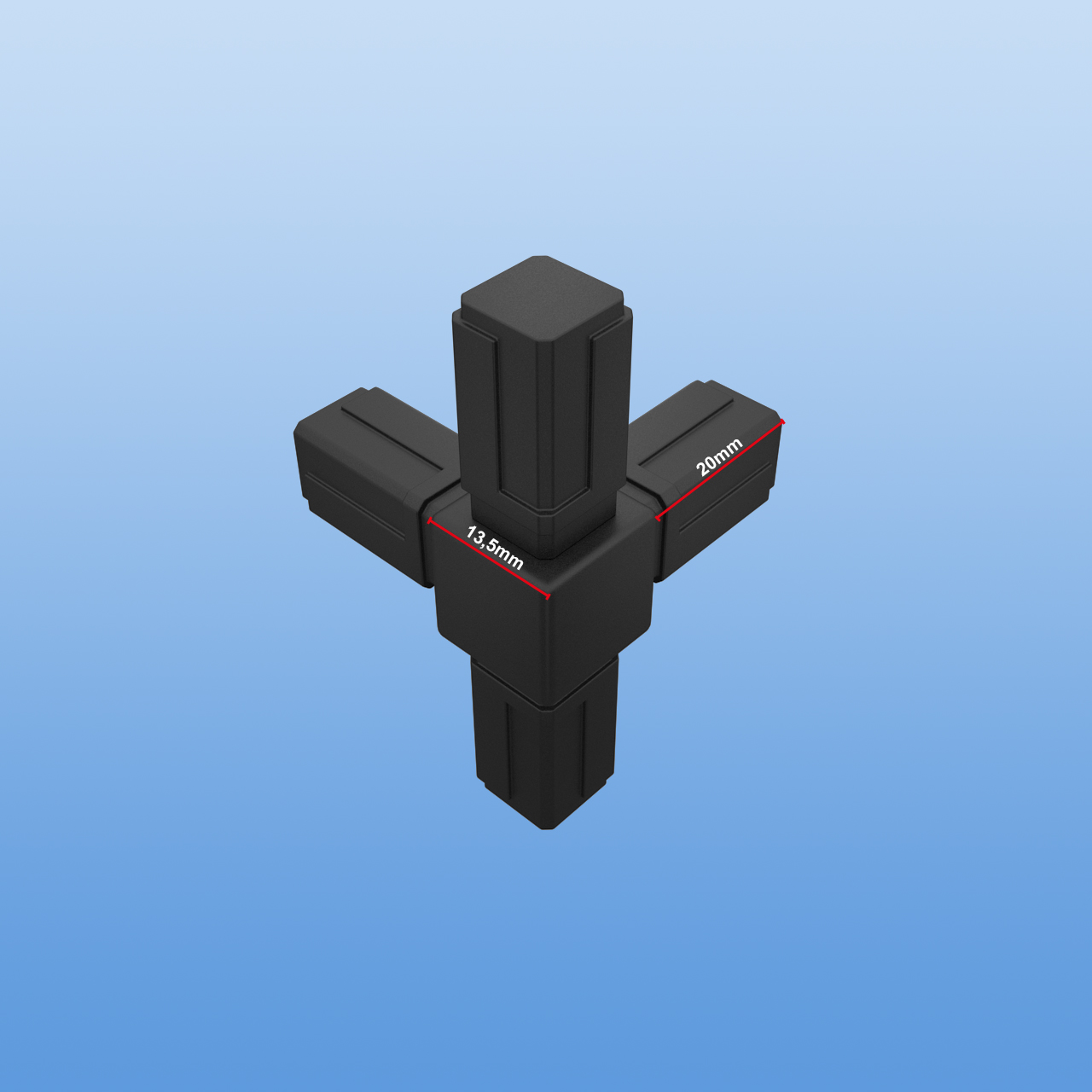 Dieses schwarze T-Stück aus Kunststoff mit zusätzlichem Abgang ist ein flexibler Verbinder für kreative DIY-Konstruktionen mit 13,5 mm Vierkantrohren. Es verbindet Rohre im 90°-Winkel und bietet durch den dritten Anschluss zusätzliche Möglichkeiten beim Aufbau komplexerer Strukturen.