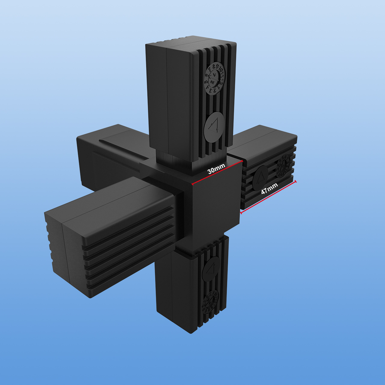 Steckverbinder für 30 x 30 x 2 mm Vierkantrohr | Kreuzverbinder mit einem Abgang | Schwarz mit Stahlkern