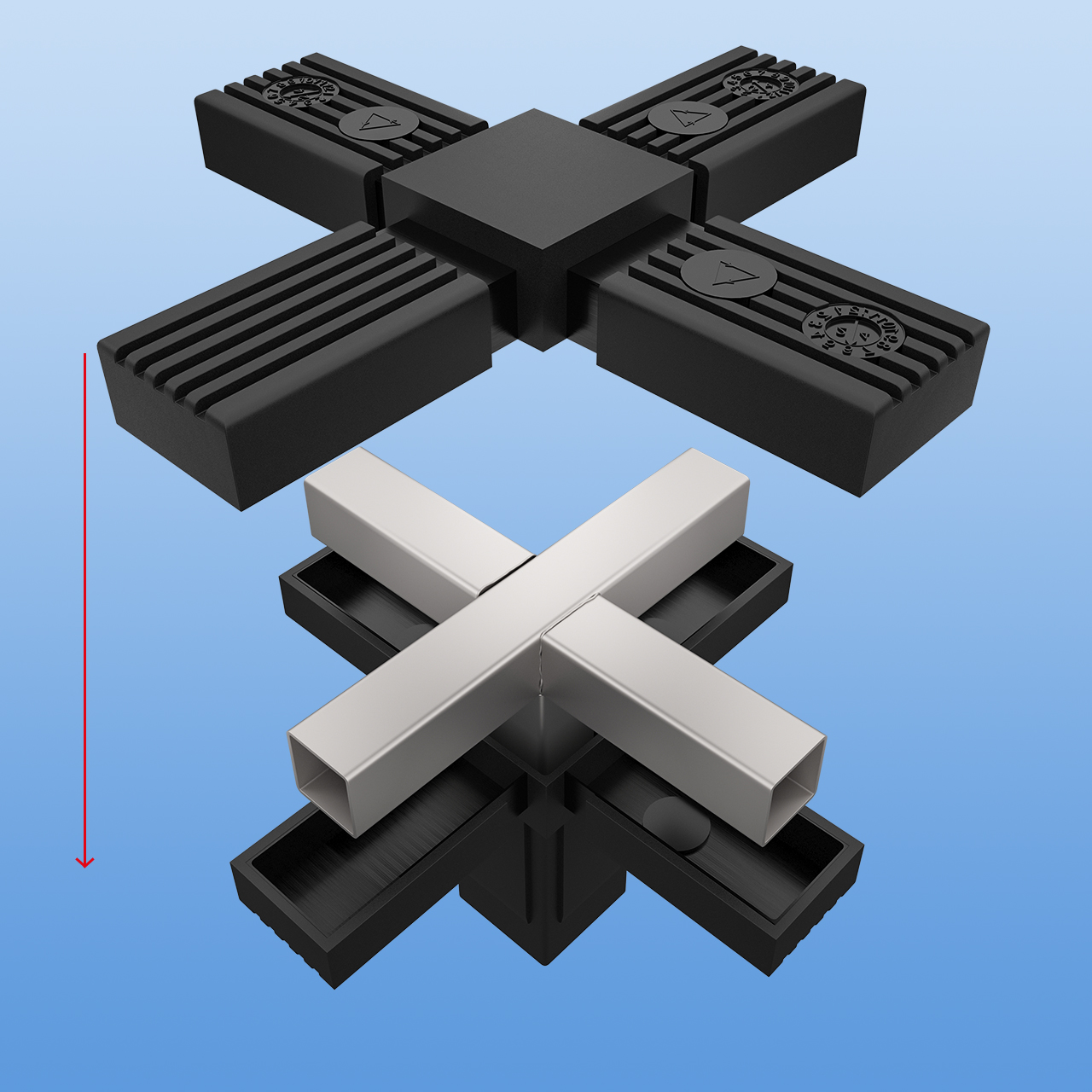 Die herausragende Eigenschaft dieses Kreuzstücks ist die Fähigkeit, Vierkantrohre in drei Dimensionen zu verbinden. Durch den zusätzlichen Abgang eröffnet sich die Möglichkeit, eine dritte Dimension in Ihre Konstruktionen zu integrieren. Dies bedeutet, dass Sie komplexe Strukturen schaffen können, bei denen Vierkantrohre sowohl horizontal als auch vertikal miteinander verbunden werden, und gleichzeitig einen seitlichen Abgang für zusätzliche Elemente haben.