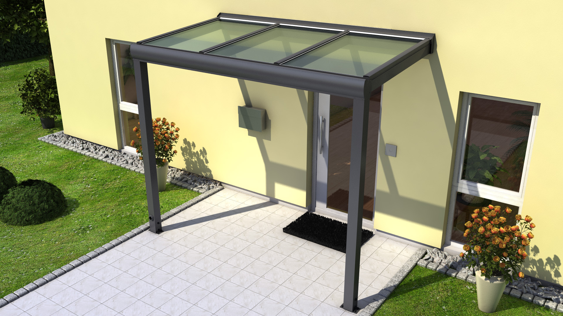 Diese exklusive Haustürüberdachung lässt keine Wünsche offen. Dieses System ist von Anfang an gut durchdacht. So besteht z.B. die Möglichkeit, in den Sparren Halogen-Spots einzubauen, so dass Sie Ihr neues Haustür-Vordach um eine Beleuchtung erweitern können. Die Verkabelung der Beleuchtung verschwindet komplett in den Profilen der Überdachung. Die Optik wird daher keineswegs beeinträchtigt. Bei unseren Vordächern für Eingangsbereiche wird das Wasser durch ein Abwasserschlauch "unsichtbar" im Inneren der Stütze entwässert.