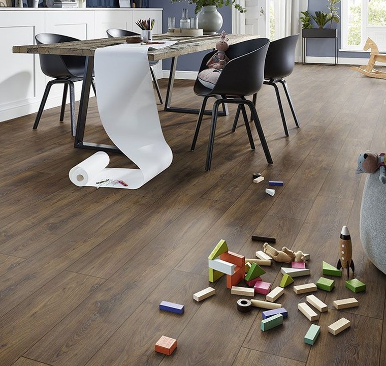 Mit einer Produktstärke von 10 mm sind die Böden besonders robust und langlebig. Die authentischen Dekore überzeugen durch eine umlaufende 4V-Fuge, die jede Diele klar hervorhebt, sowie durch eine synchron geprägte Oberfläche, deren fühlbare Struktur exakt der natürlichen Holzmaserung folgt.