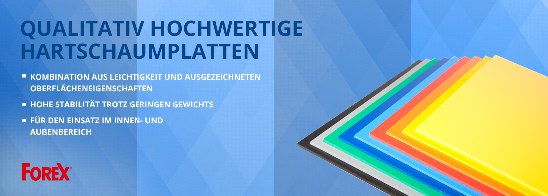 FOREX® ist seit 30 Jahren Synonym für weiße, feine Vollkunststoffplatten aus PVC. Die FOREX®-Produktfamilie (FOREX®classic, FOREX®print, FOREX®color) bietet eine große Auswahl an leichten, hochwertigen Plattenmaterialien für Innen- oder Außenanwendungen mit einer großen Angebotstiefe (3 Produkte, 10 Dicken von 1-19 mm, 9 Farben, 4 Breiten, 3 Längen, mit oder ohne Schutzfolie). Auch Individualität ist willkommen: Sonderfarben, Spezialverpackungen und sogar die Produktion nach einer Kundenspezifikation sind fester Bestandteil des FOREX®-Angebotes.